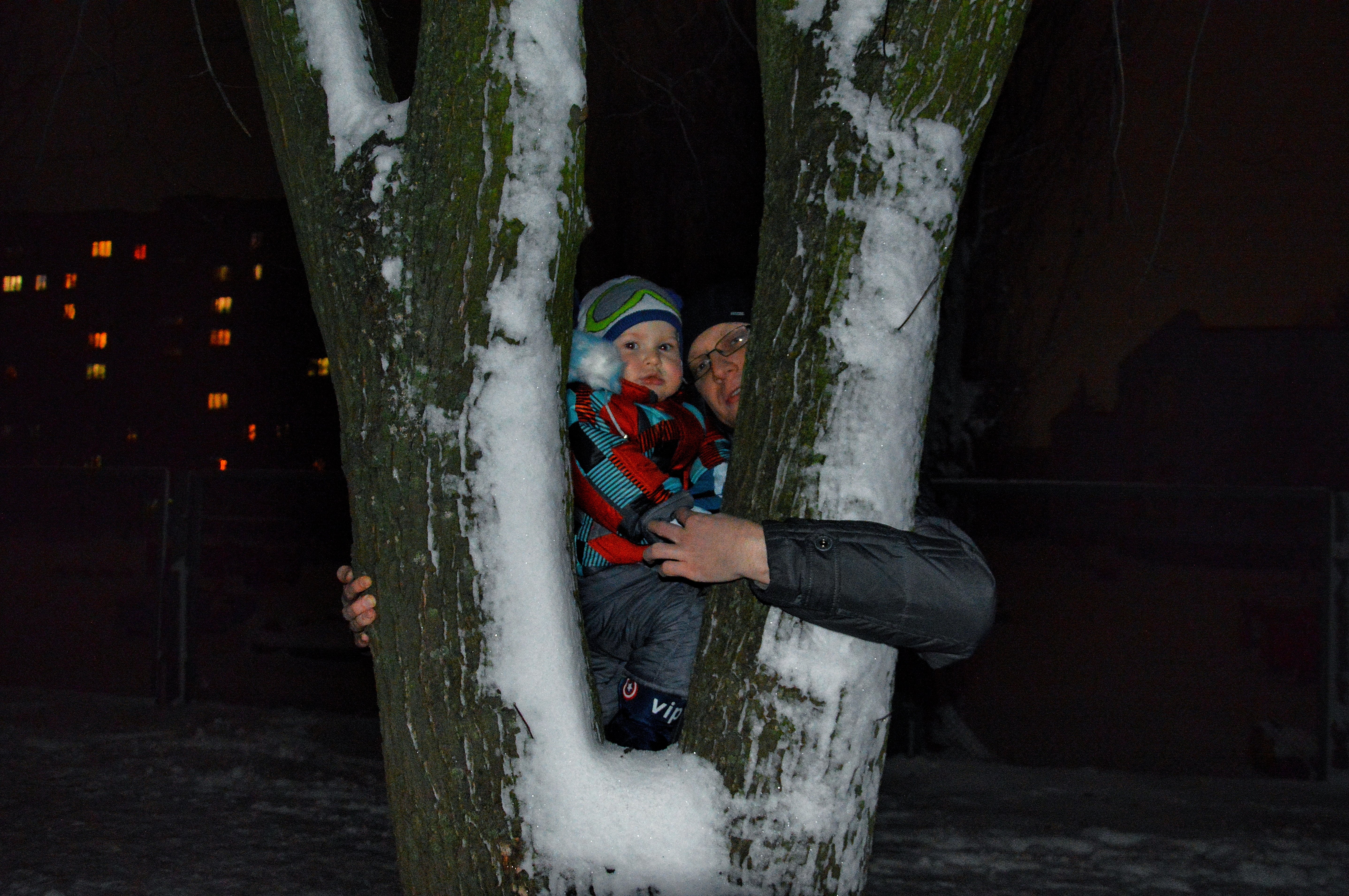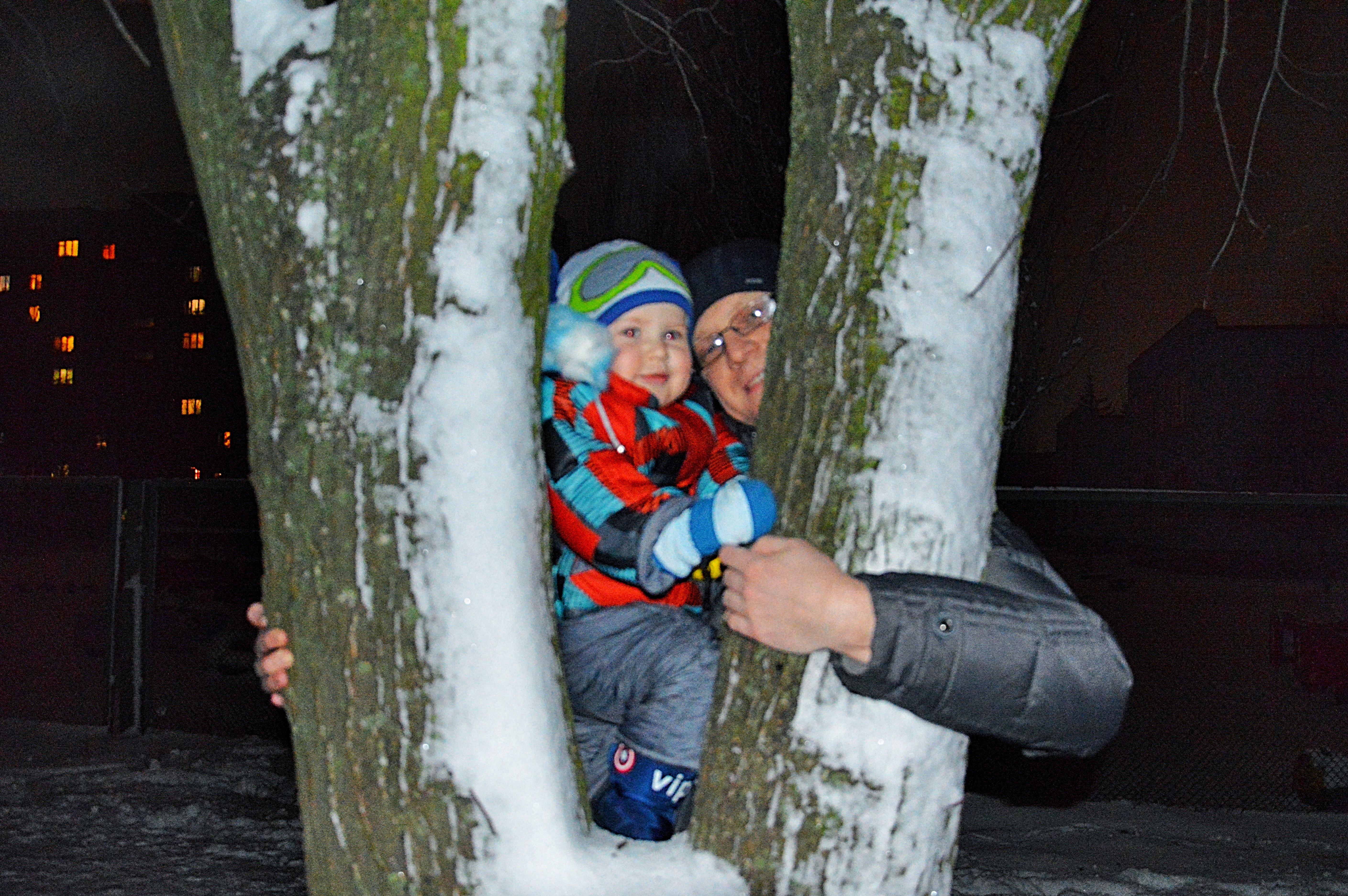 У нас в Украине. Наконец выпал снег. Но, уже сегодня было 0 градусов Цельсия. И все начало таять. Чтобы не пропустить долгожданный снег, мы семьей вышли фотографироваться на улицу. Я очень хотел попробовать обнять дерево, чтобы сделать фото, но мой сын мне этого не давал. Пришлось делать групповой снимок. На нем Вы видите меня, сына и дерево.