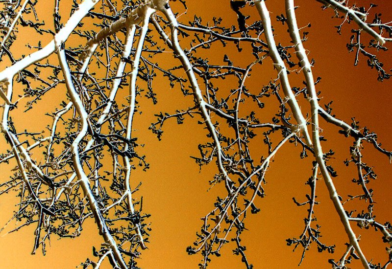 This was taken on a cold winters day when there was white frost on the tree branches. The sky was blue and it was sunny. I wondered what it would look like with reversed colours and I really like the golden sky.