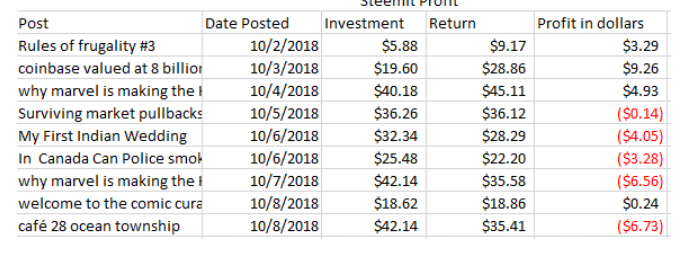 Thats a 24% profit. Not bad but you only get this percentage on low value posts. Also it looks like Im losing 3% - 4% per day on my post value. My 24% profit might be cut in half by payout. 3% × 5 = -15%.