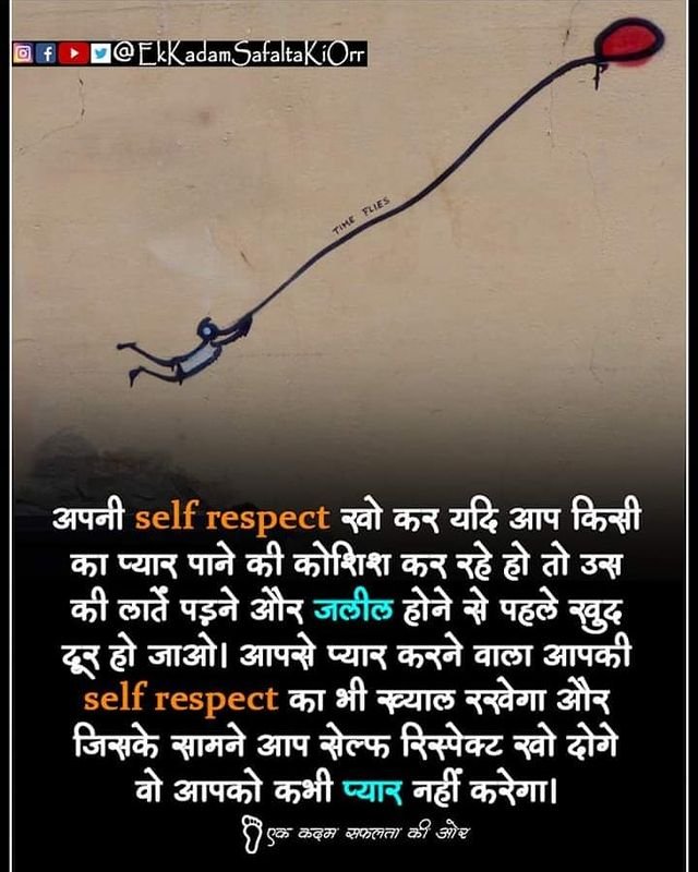 अपनी self respect खो कर यदि आप किसी का प्यार पाने की कोशिश कर रहे हो तो उन्स की लातें पड़ने और जलील होने से पहले खुद दूर हो जाओ। आपसे प्यार करने वाला आपकी self respect का भी ख्याल रखेगा और जिसके सामने आप सेल्फ रिस्पेक्ट खो दोगे वो आपको कभी प्यार नहीं करेगा| कदम सफलता की ओर'.
