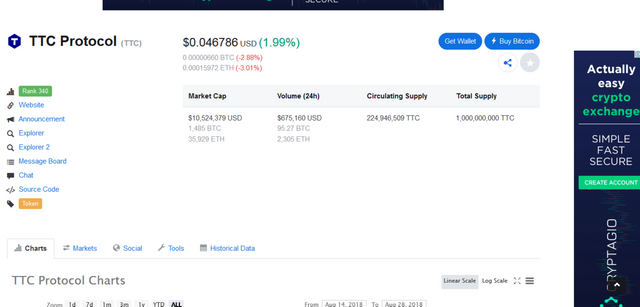 Coinmarketcap view of TTC