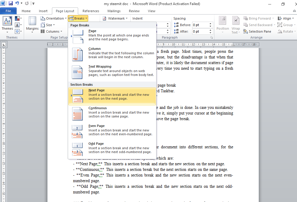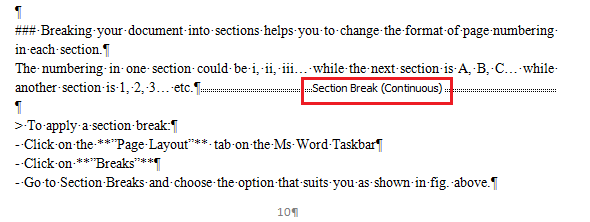 - Go to Section Breaks and click on the option that suits you as shown in fig. 6 below: