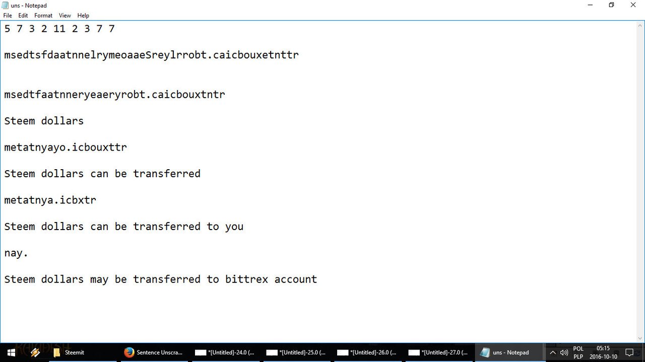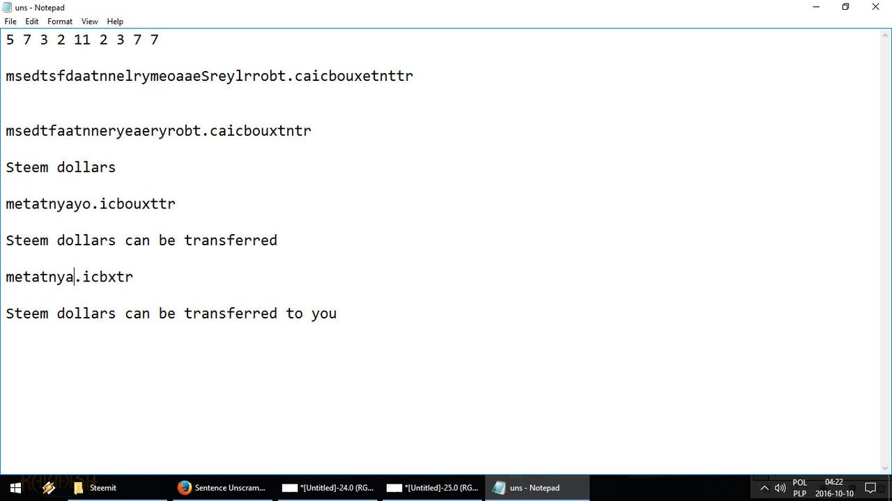 We know the number of letters in the first word and we know the letter it begins with. As the previous unscrambled sentence had something to do with Steemit, I decided to try something similar for the upper case S. The five letter word at the beginning could be Steem and my first thought for the next word was power, but of course it hasn't got enough letters. Dollar was another word that could follow Steem, and to fill all the seven blanks in the second word I used the plural form dollars. Then I copied all the letters from the post once again and started removing S, T, E, E, M, D, O, L, L, A, R, S from the copy (it doesn't need them anyway ๐). That way I could quickly go back to the original letters, if I wanted to try something else.