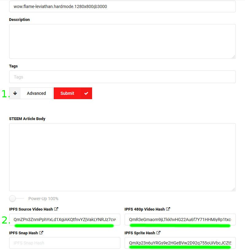 Now go to the bottom and unfold the Advanced (1.) section. There will be 4 hashes (2.) you can copy and save in notes or wherever you like.