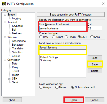 Optionally, in order to save time and not type these details every time, you can fill the box marked with yellow color with the server's name, and click save, before clicking open. The next time, you will see an entry there with the name you entered. You just double-click it, and it will connect.