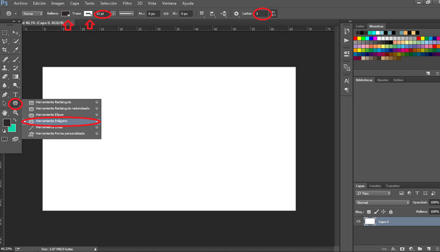 En las herramienta de un lado, seleccionaremos de figuras, clickeamos con el segundo click(derecho)y saldrán otras figuras, seleccionaremos *herramienta polígono, luego nos fijaremos que en Relleno tenga el color(de su preferencia)negro, y Trazo(de su preferencia)blanco,tamaño numero 13 y en un costado donde dice Ladocolocares el numero 3.