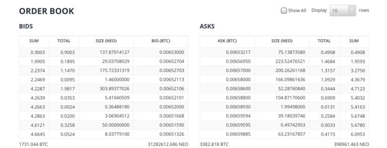 The equivalent in BTC for this sum of NEO tokens is called "Total", while a cumulative sum is calculated under "Sum". For the bid prices, this cumulative sum is calculated by adding the total values of all the more expensive bid orders to the total value of the price in question for a given price. Similarly, in the case of Ask prices, the sum of all total values for cheaper Ask orders and the total value of the considered Ask orders is calculated.