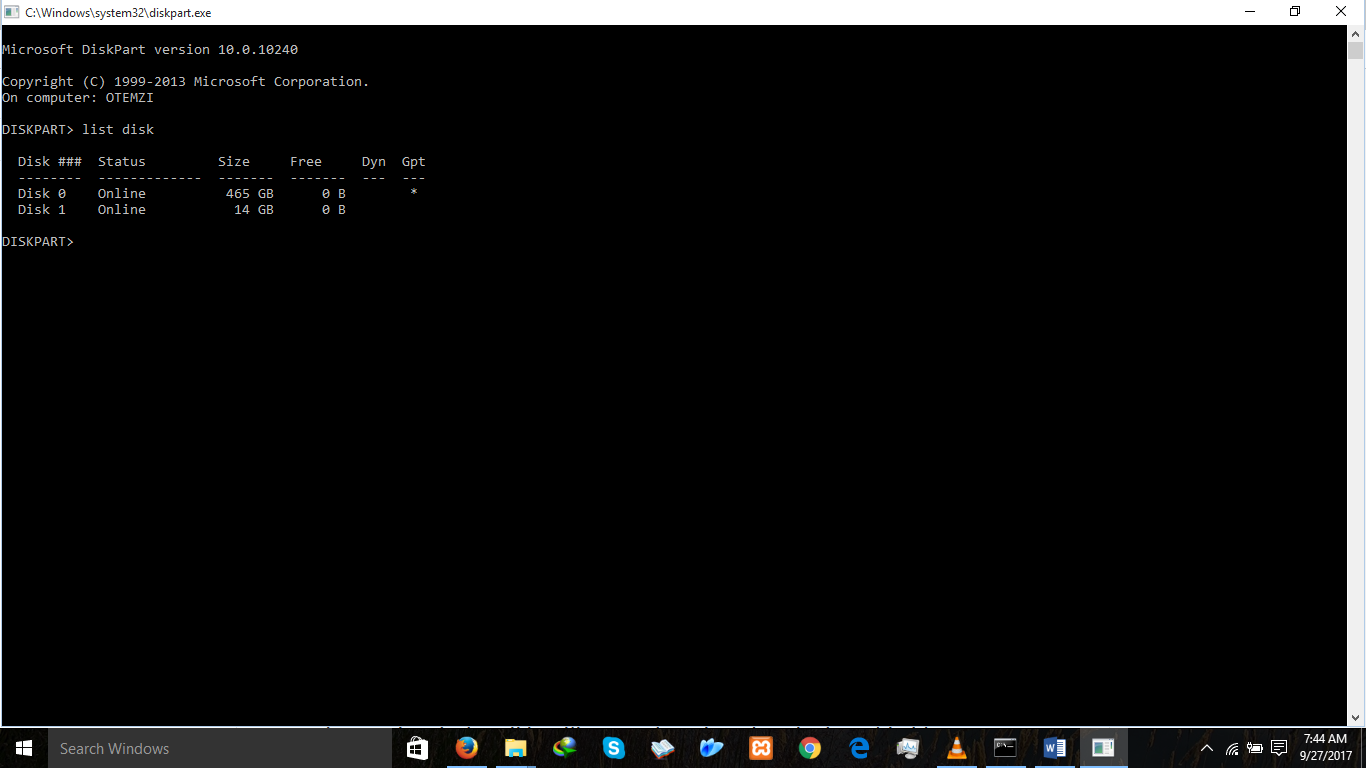 c. type in 'list disk' -this will show the present storage devices present in your system