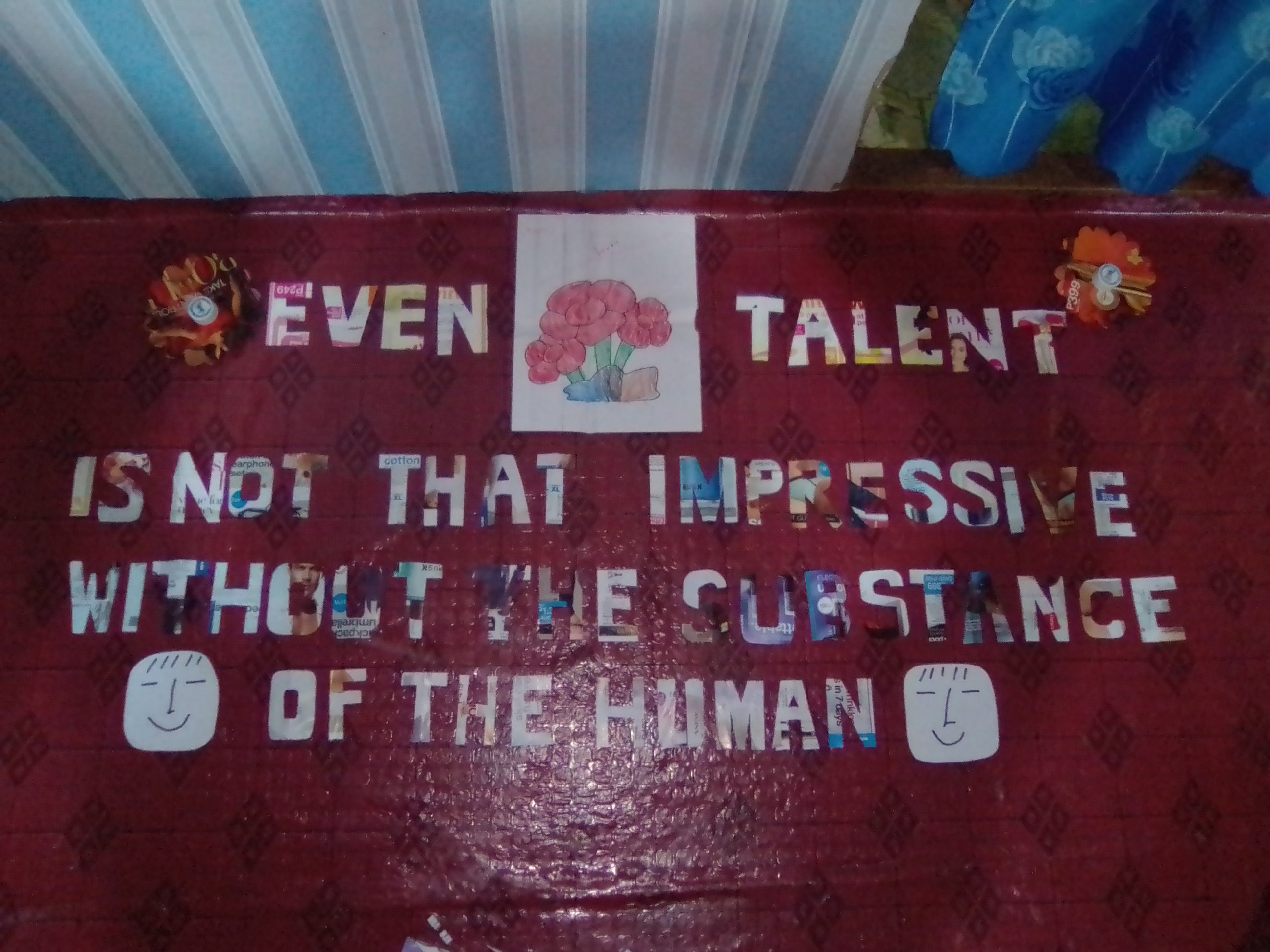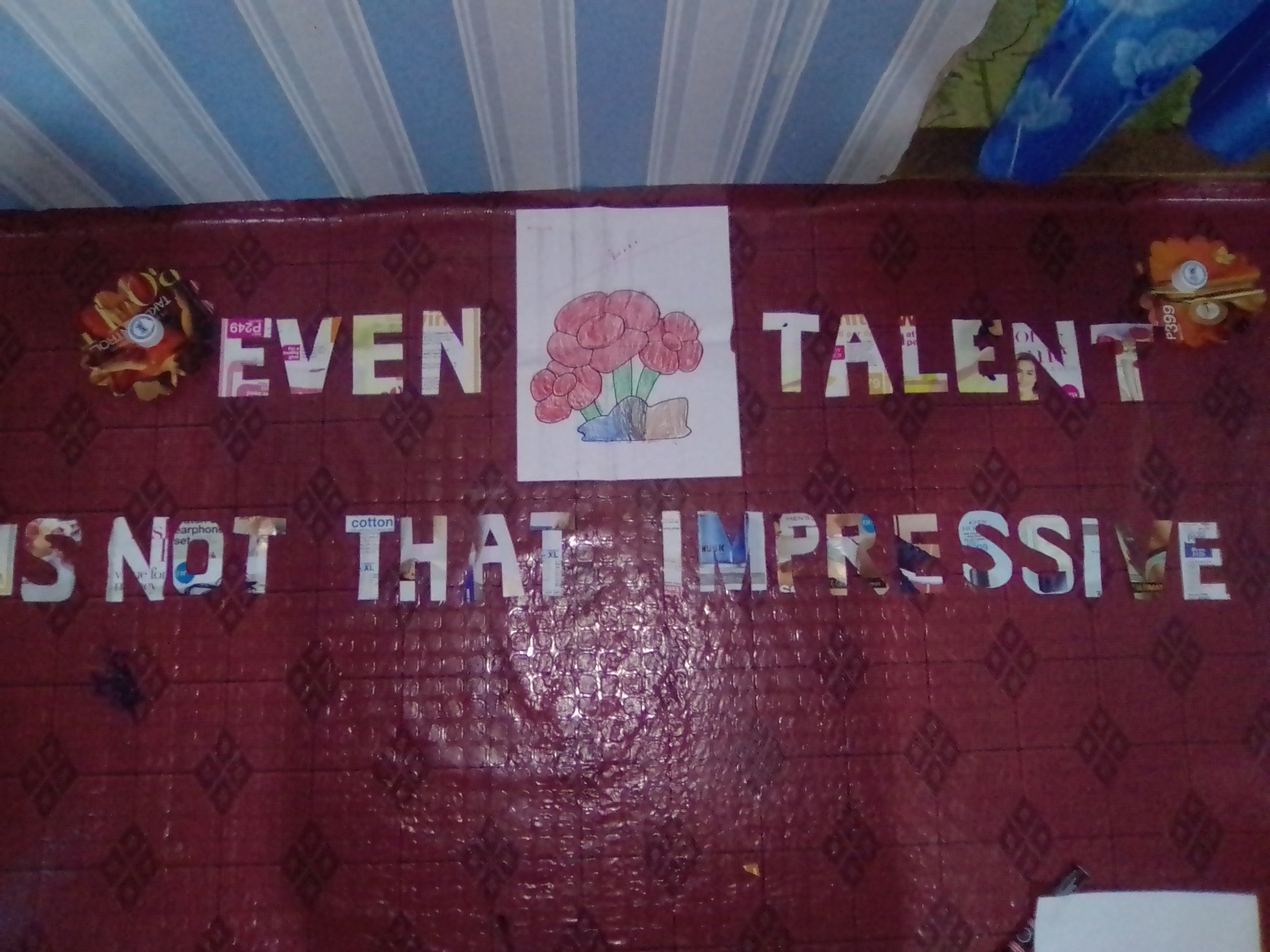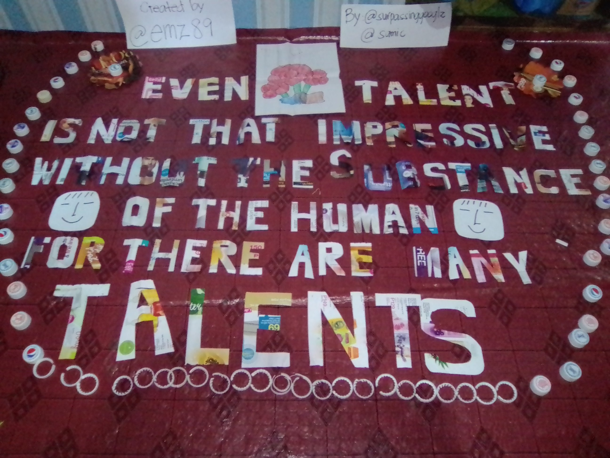 Materials: an old brochure,scissor,marker,used bondpaper,a cover of softdrinks,and an art of my eldest daughter Vhinysah when she was 4 years old, represents the word "TALENT".
