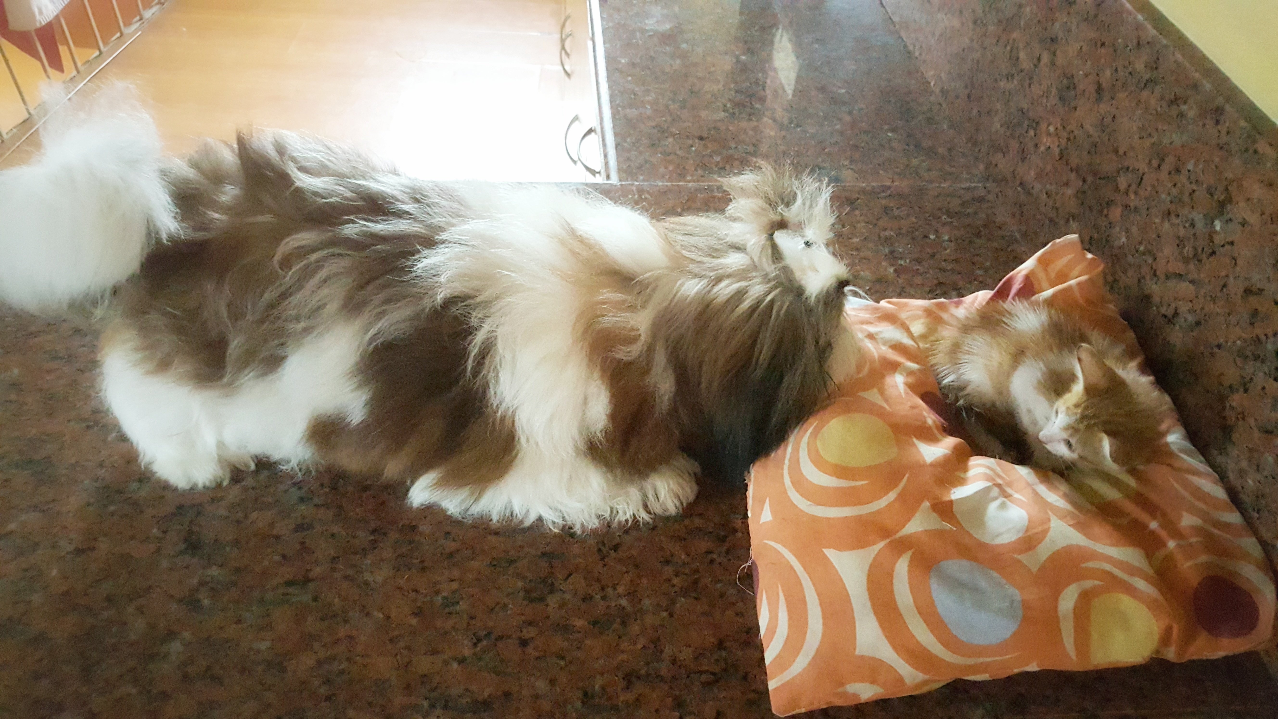 Look who's being nosy. Fudgee is checking out my adopted kitten.