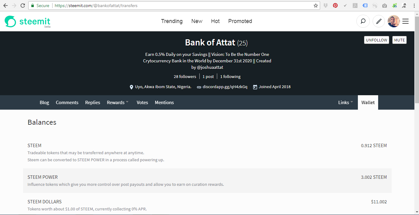 My name is Joshua Attat and am the brain behind Bank of Attat @bankofattat a bank/wallet where you can store your Steem/SBD and earn 0.5% interest on it daily. It's better than keeping it in your wallet where it can either lose its value or fall victim of phishing attempts. So I started running the bank sometime last year with my personal account in order to build trust; we recently created an official account for the bank and we've migrated there.