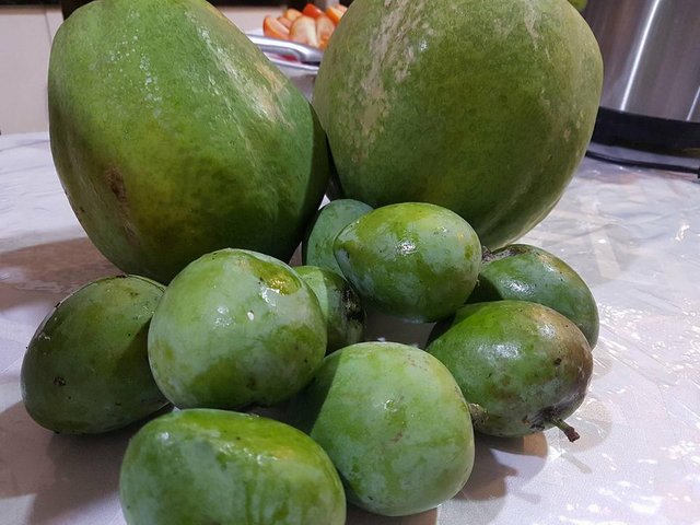 Out of all the wonderful sight in our garden today, the Papaya takes the cake. We ended up harvesting the giant fruits after waiting for months. It seemed like all they wanted to do was grow and didn't show any sign of getting ripe until this week. We harvested all the fruits that were showing some yellow lines and gave some to our neighbors. In return, we received a handful of green mangoes that they also harvested from their mango tree.