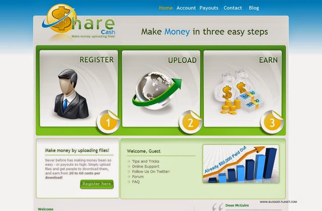 Get around 1$ to $20 for each downlod. They Support Paypal, Payza , Payoneer, Payquiker, Bank transfer and Checks. There is a Survey before every download that user has to go through to download file. If your user fulfill survey requirement then he allows to download your uploaded file and you get pay for that download. Sharecash.org supports 200 country downloads.