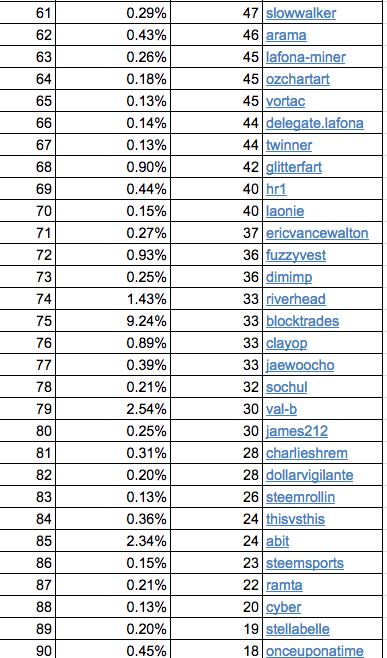 So as you can see - only a few people is voting and they are for the most part only voting for a few people, this can be more optimised by actively using this bot to bring votes out to content-creators without voting for scam and spam and plagiarism. And is something even 3rd party voting-sites should implement so that we get more votes around every day, because it gets much worse then this if we go further down the list: