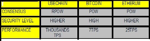 This table shows that Bitcoin and etherum have POW consensus but Usechain has RPOW (Randomized Proof of Work) consensus algorithm which can achieve high frequency transaction verification.
