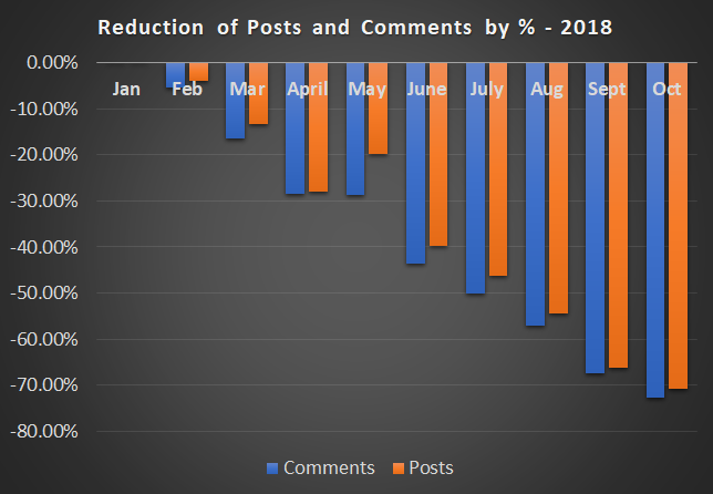 - Posts and Comments are down over 70% from January 2018 to October 2018