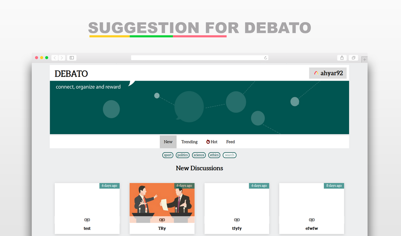 Debato has been very interesting in my opinion, but still needs further development to make Debato more attractive. Therefore, I want to suggest some features to make Debato more attractive.