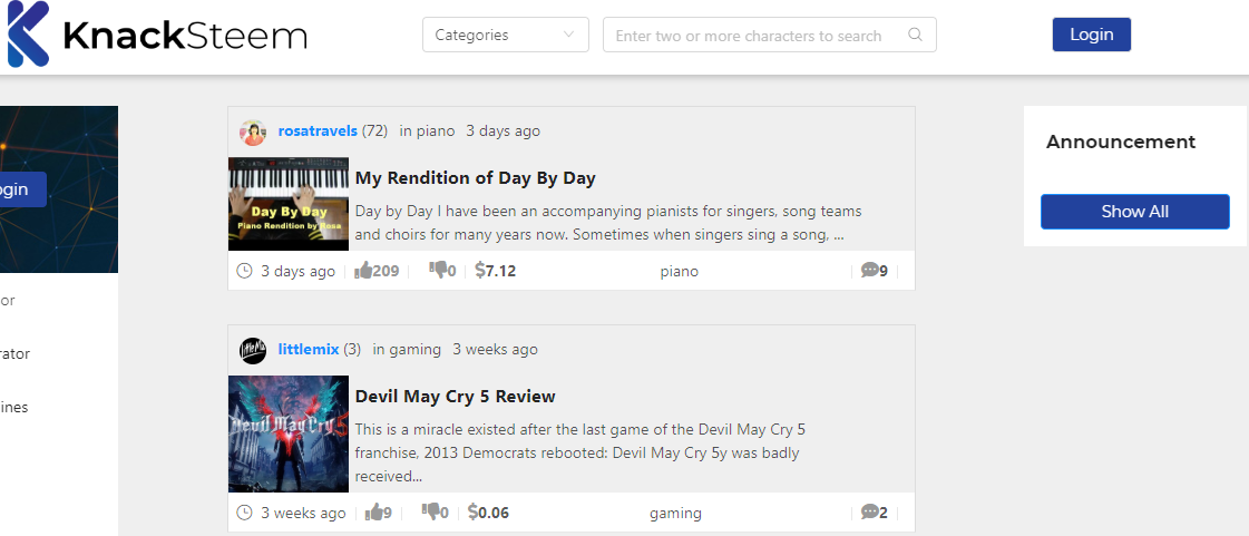 Talent Categories: KnackSteem provides nine categories for which users can showcase their talents and skills. These are; Altruism, Arts, DIY (Do It Yourself), Documentary, Fashion, Gaming, Humor, Music and Tech Trends.