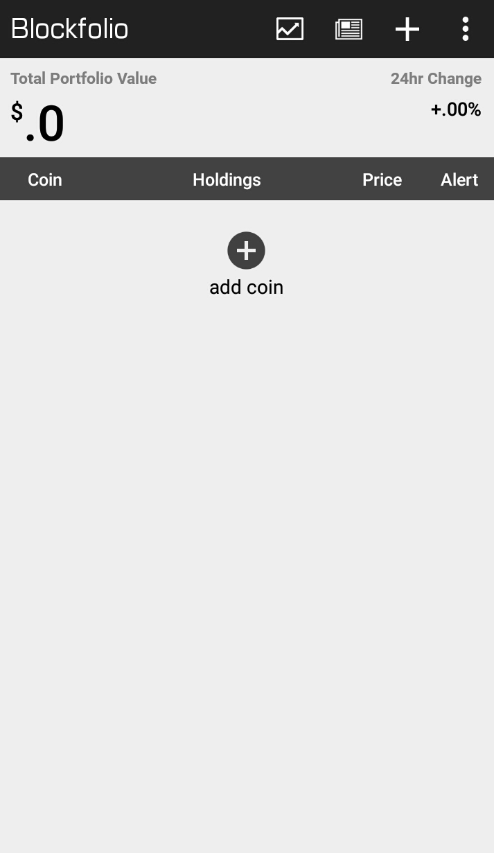 Uygulamayı indirdikten sonra karşımıza aşağıdaki resimde görüldüğü şekliyle bir ekran çıkmaktadır. "Total Portfolio Value" bölümü toplam yatırım miktarımızı göstermektedir. Bu konu da ileride ki bölümler daha açıklayıcı olacaktır. "24hr Change" bölümü, yatırımlarımızın bize kazandırdığı 24 saatlik kazancı göstermektedir.
