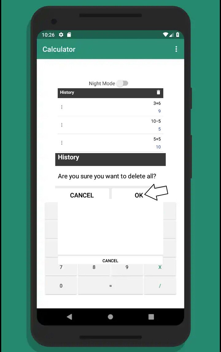 We recommend that developers add this feature at the top of the application's display. In the History feature, the developer must add all the history of the results of calculations that have been done before, and give the user the choice to delete them.