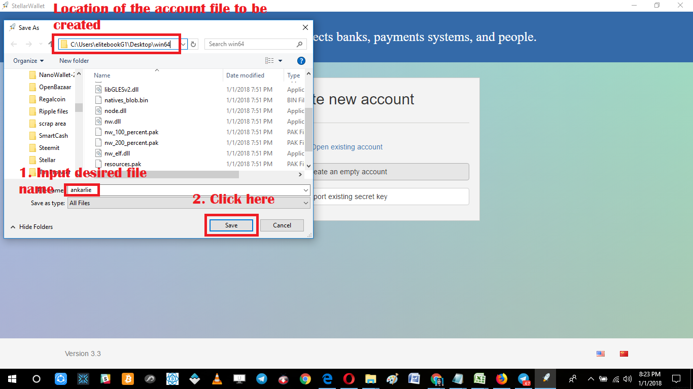 The next step will ask us to create the account file for the wallet. Just enter the desired name and save. Please note where the file is located. In this tutorial I keep it at the same folder of the Stellar Desktop Wallet the folder "Win64" in desktop.