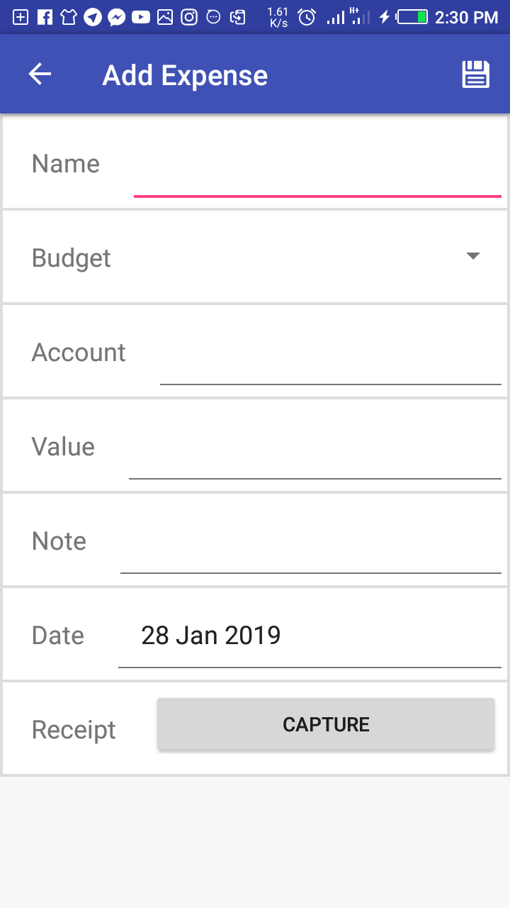 - A page opened with the following boxes; Name, Budget, Account, Value, Note, Date and Receipt. Simply fill the boxes as they matter to you. The most important boxes are Name, Budget and Value- they make it possible for the app to deduct transaction from budget. To keep track of what I have spent on, more vividly, I included the account from which I debited the money from, I took note of the transaction purpose.