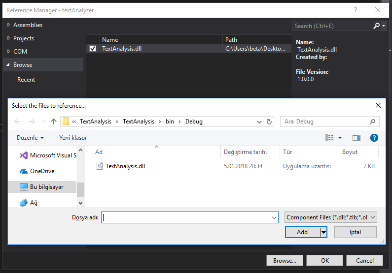 After add TextAnalysis.dll file to references, creat a new Analysis object and call the metod you want.
