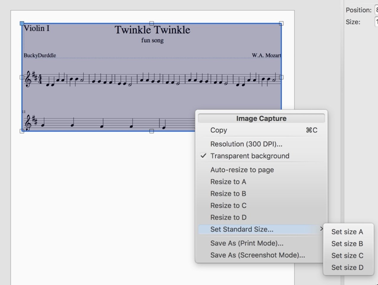 MuseScore has a built-in image capture utility. This can be very useful. There will be many occasions when you will need to take an image of a portion of a score to share with other musicians or students. This utility provides us with a variety of image options.