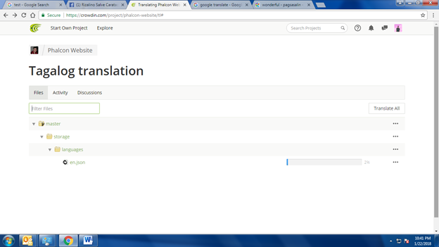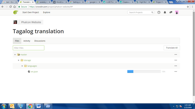 I started my translation today on the file entitled “en.json” This file is under the folder “languages”. I translated the words starting at the very first word and finished at 1041 words, ending in the second page. And I was able to have a progress from 0% up to 18%.