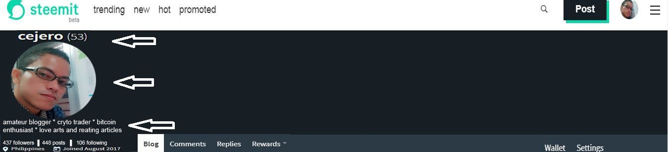 This is what my steemit profile looks like with my steemit profile pic with the red arrow, and the description detail about me enclosing with the yellow box, and lastly the cover image which you can see as the background of everything, in my case it was a footer.