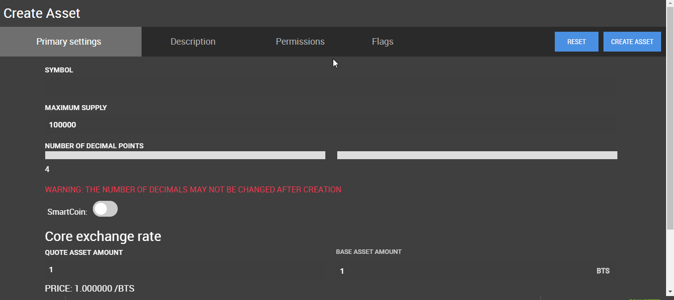 Fill-in your symbol, maximum supply, whether it is a SmartCoin or not, and the core exchange rate like so: