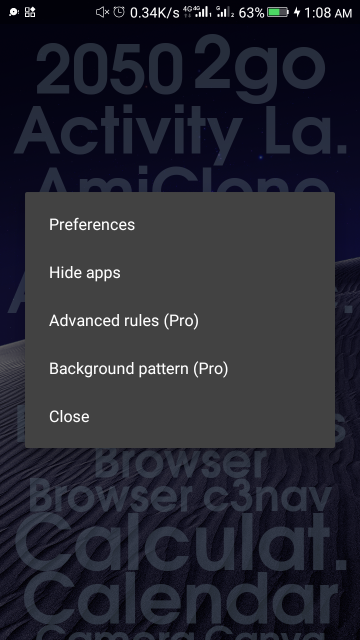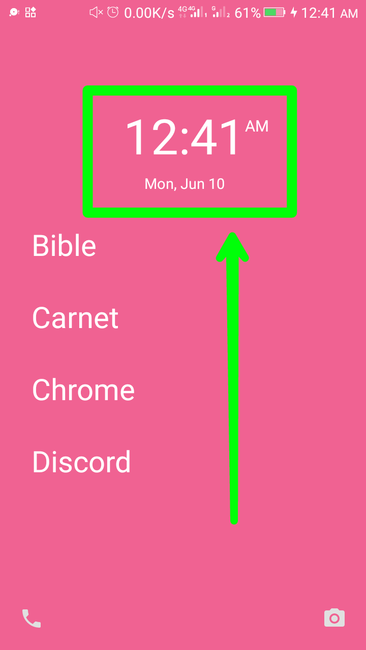 Home Screen: The home screen is where the result and aim of the app appears, it's more like a conclusion of what the launcher is about. It embeds some features which I'll list below. Also, on the home screen, the background is always a colour which the user can select in the options feature.