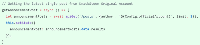 We should show the last post made from Official KnackSteem account as an Announcement Post. Thus using teh Config value of the Official account taking the most recent post from the Service.