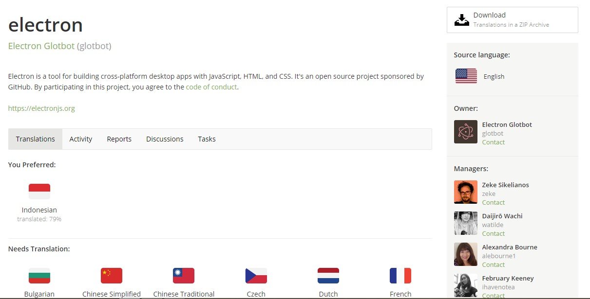 I contributed the translation on the Electron project by translating the electron-versioning.md file to completion or 100%. I translated electron-versioning.md with a total of 647 words and completed about 37 strings into Indonesian.
