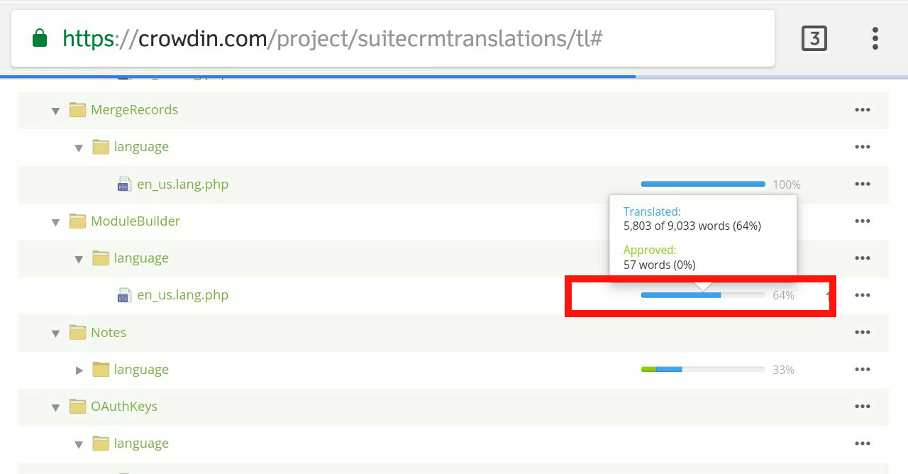 This is my 7th contribution in SuiteCRM core project and I continued my translation on the file entitled "ModuleBuilder" has a string namely "en_us" this string is under in "lang.php”. For this single file, I translated 1,069 words and considering the previous transated words I progress a total of 6,868 words out of 9,033 words for this file. And I was able to have a progress from 64% up to 76% for this file.