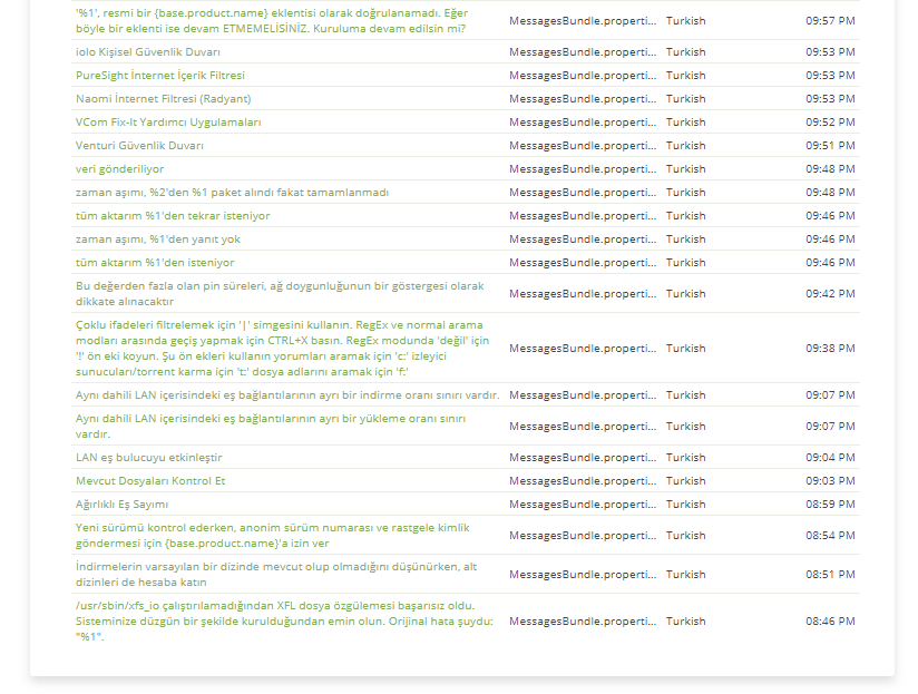Çoklu ifadeleri filtrelemek için '|' simgesini kullanın. RegEx ve normal arama modları arasında geçiş yapmak için CTRL+X basın. RegEx modunda 'değil' için '!' ön eki koyun. Şu ön ekleri kullanın yorumları aramak için 'c:' izleyici sunucuları/torrent karma için 't:' dosya adlarını aramak için 'f:' MessagesBundle.properties Turkish 09:38 PM