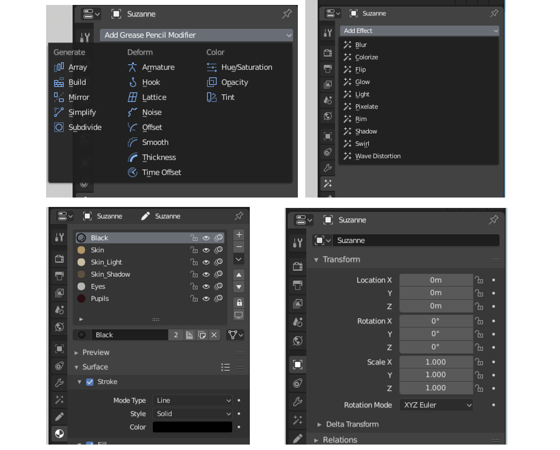 To start using the grease pencil, one need to first create the grease pencil object. Shift A, to add an object, and the grease pencil will appear there. There are three options: an empty, a stroke and Susanne the monkey.