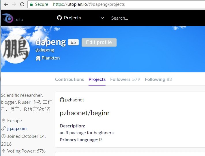 In my profile on Utopian.io, the github repo beginr is listed in my project page, which is show in the screenshot as follows.