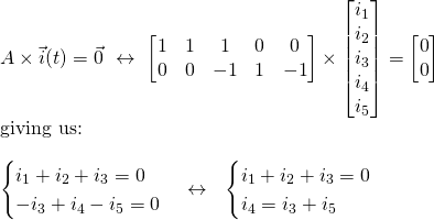 KCL tells us that the the sum of all currents leaving a node is equal to the sum of all current entering the node. Putting a positive sign when they are leaving and a negative sign when they are entering the total sum of all currents is zero. Thinking about the Incidence Matrix, this matrix gives us the sign of the currents in the sum and so using only the Reduced Incidence Matrix A and the vector of branch currents i(t) we can write KCL as: