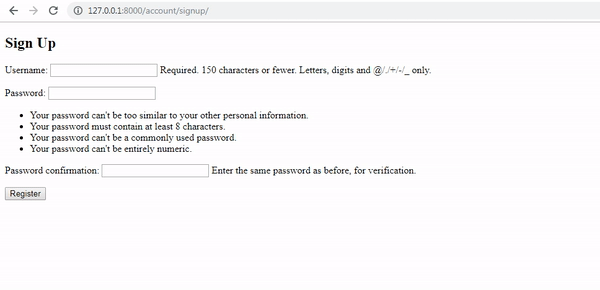 Now we will try the user registration feature on the application that we created. For user registration, Django has created an automatic database that will save users who register. for more details, we can see the demonstration in the picture below: