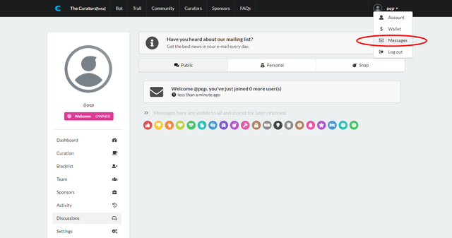 generaldiscussions center where all discussions take place. messages here are visible to all and stored for later retrieval - personal: personal messages are for sending messages to other team members of curator. they are stored in plain text in the db for later retrieval hence not private