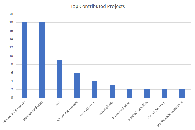 This time utopian-io and steemit.com came to a tie with 18 contributions each. Followed by eSteemApp/esteem with 6 contributions.