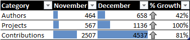 As of date, authors grew by 42%, projects by 100%, and contributions by 81%.
