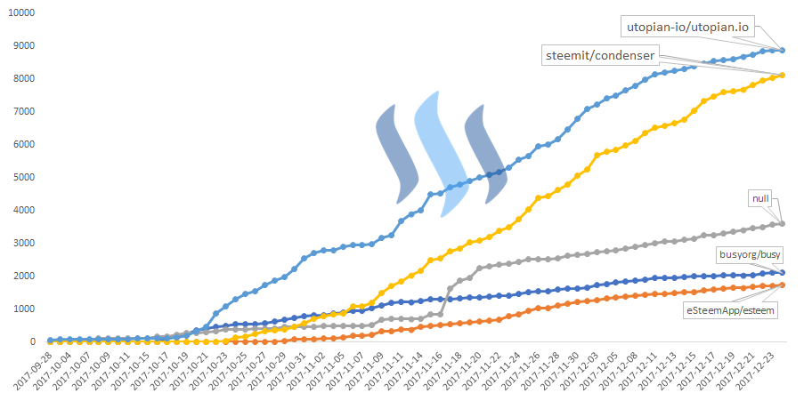 An interesting story here was the total comments for each project were close - 8894 comments for utopian-io/utopian.io and 8117 comments for steemit/condenser. This author also observed the gap shrinking in the growth chart (right).