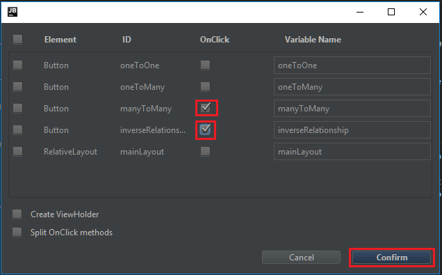 @OnClick({R.id.oneToOne, R.id.oneToMany, R.id.manyToMany, R.id.inverseRelationship})