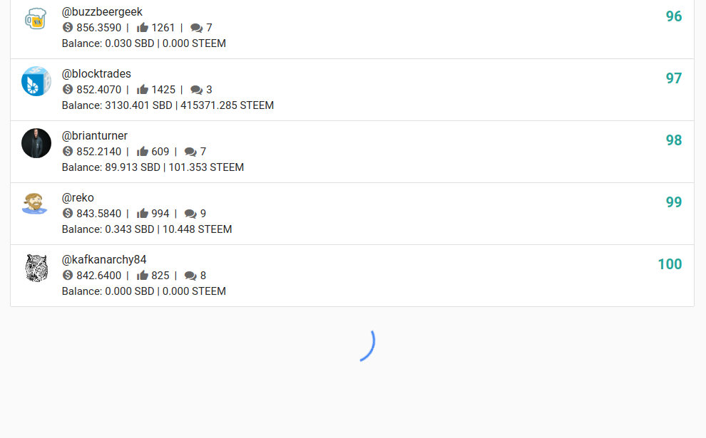 But now you can do it all. I updated SteemRank — now it displays positions of each author and allows loading any number of authors, you need just scroll to the end of the page and the load will start automatically. Also, I added the loading indicator because until that update you even could not get info about the start of the loading.