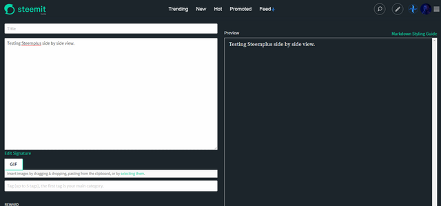Steemit's post editor without Steemplus is displayed up and down. That is, where you are typing the content and the preview.