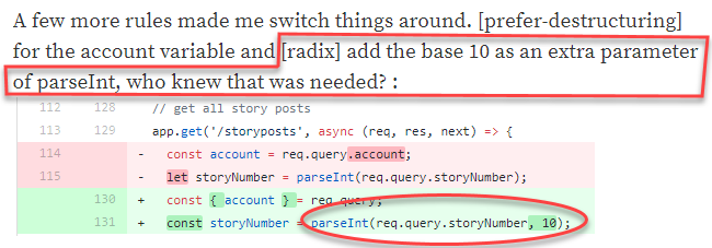 A few more rules made me switch things around. [prefer-destructuring] for the account variable and [radix] add the base 10 as an extra parameter of parseInt, who knew that was needed? :