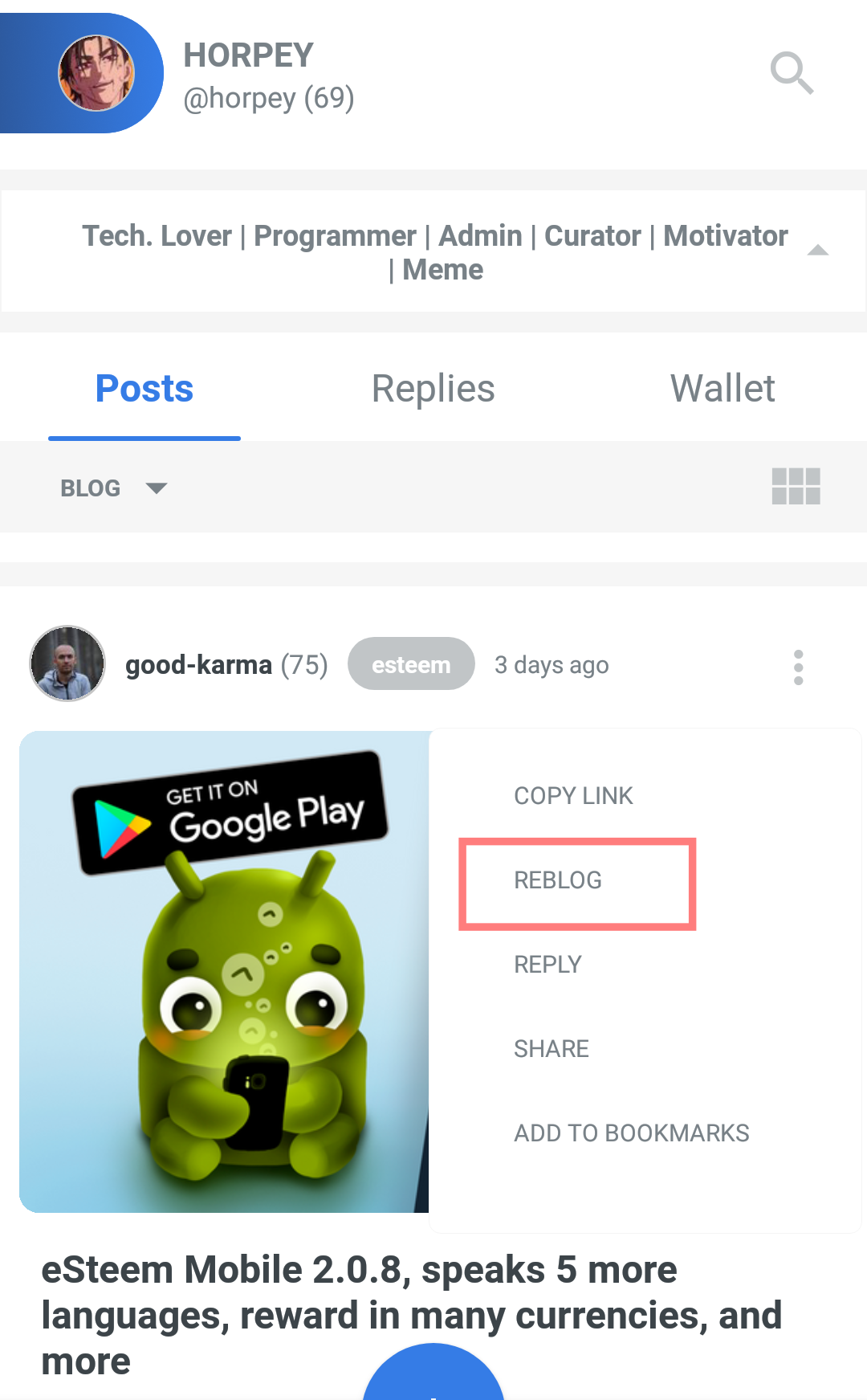 eSteem v2.0.9 - Reblog option on reblogged posts