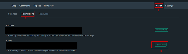 Go to "wallet" then "permissions" and click on "login to show" and then the "show private key" button will appear next to "Active". Copy that.